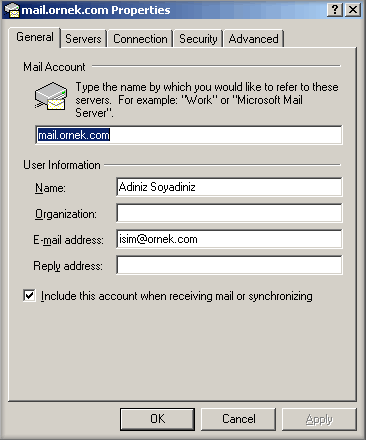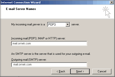 Gelen (Pop3) ve giden (Smtp) sunucularınızı aşağıdaki örneğe göre; mail.ornek.com şeklinde yazınız. Giden posta (SMTP) sunucusuna kullandığınız ISP'nin mail server adresini de yazabilirsiniz.
